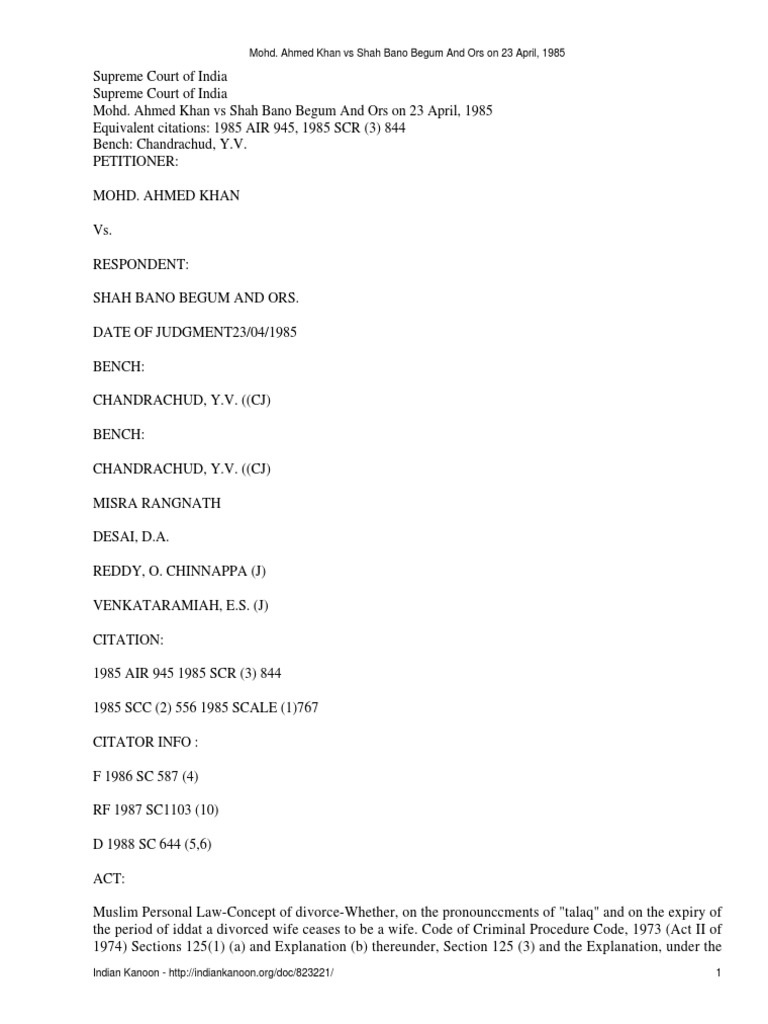 F 1986 sc 587 (4) rf 1987 sc1103 (10) d 1988 sc 644 (5,6) act: This case is a landmark case on gender equality and divorce especially as it refers to indian muslims. 1985 air 945 1985 scr (3) 844 1985 scc (2) 556 1985 scale (1)767 citator info : It is also referred to as the "shah bano case". Shah bano begum 1985 (1) scale 767 = 1985 (3) scr 844 = 1985 (2) scc 556 = air 1985 sc 945 facts. People get magnesium from their diet, but sometimes magnesium supplements are needed if magnesium levels are too low. Shah bano begum 1985 (1) scale 767 = 1985 (3) scr 844 = 1985 (2) scc 556 = air 1985 sc 945, commonly referred to as the shah bano case, was a controversial maintenance lawsuit in india, in which the supreme court delivered a judgment favouring maintenance given to an aggrieved divorced muslim woman. Adverse events (including thromboembolic events) did not differ significantly in the. We would like to show you a description here but the site won't allow us. Magnesium is a mineral that is important for normal bone structure in the body. 1831), who was a founder of wahabism in india. Ahmed khan, a renowned lawyer for. Jun 11, 2021 · mohammed, s.
